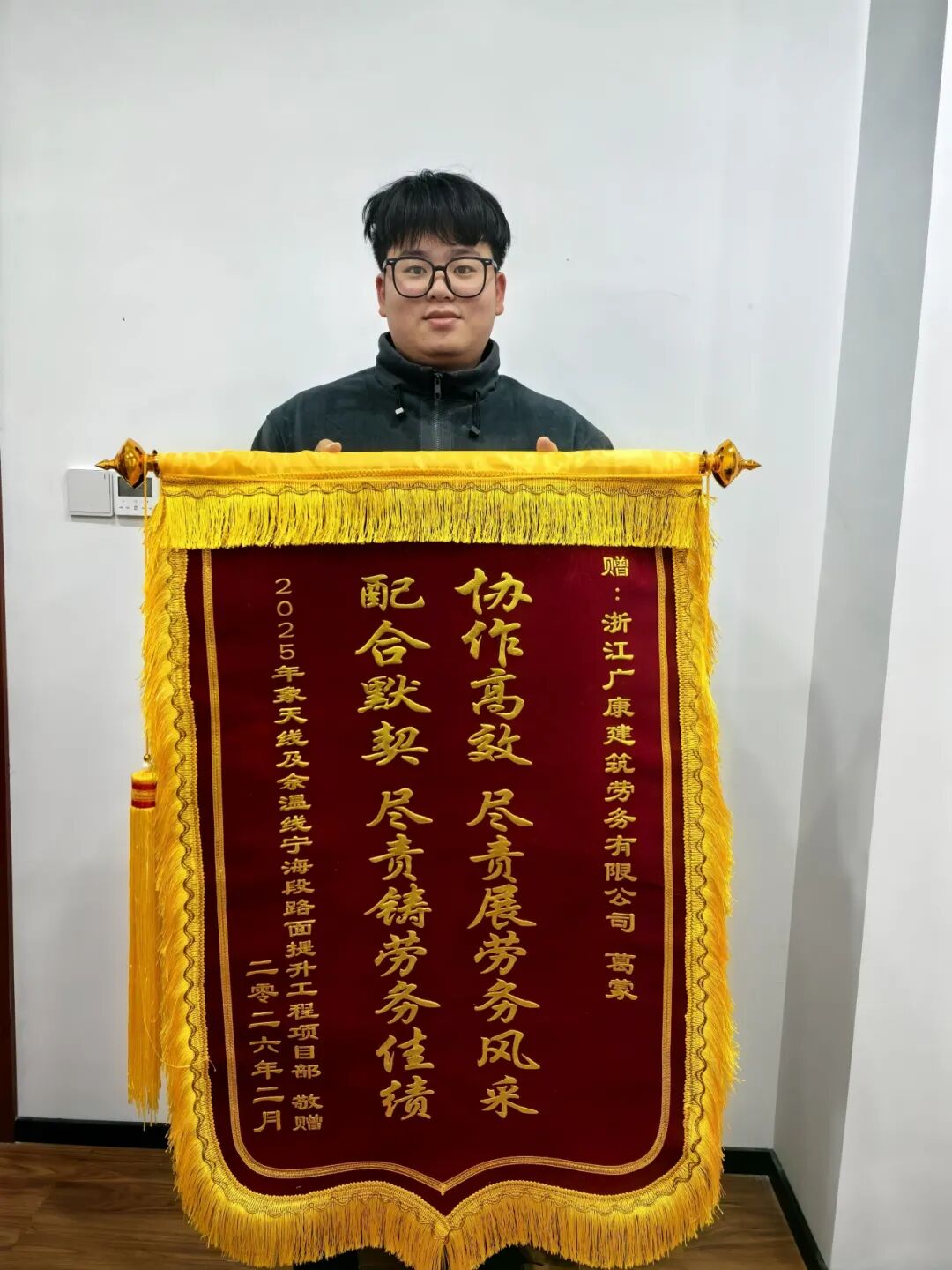 近日,公司收到2025年象天线及余温线宁海段路面提升工程项目部赠予的锦旗,公司员工葛蒙作为该项目核心劳务管理人员,凭借过硬的专业能力与高度的责任担当,助力项目稳步推进,携手公司获得此项殊荣。这份荣誉不仅是对葛蒙个人工作的充分肯定,更是项目部对广宜集团专业服务能力的高度赞誉。